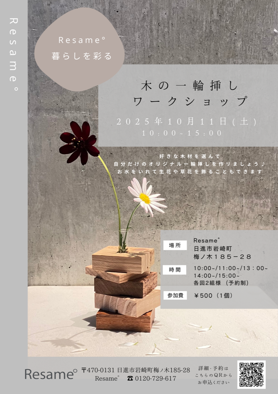 日進市を中心に注文住宅の新築・リフォームを手掛けるResame°です。みなさんご自宅に「自分の手で作ったもの」はありますか?おうちづくりを提案しているResame°は「家」だけではなく「豊かな暮らしに繋がる取り組み」も提案しています。そんな中大人気企画が「木の一輪挿しワークショップ」。あなたの手で、世界に一つだけの一輪挿しを作ってみませんか?材料の木も一つとして同じものはありません。自分や家族が手掛けたものをおうちのインテリアの一部として飾ると、いつもの毎日がより豊かになりますよ♪ただ、参加いただける人数に制限がありますのでご興味がある方はお気軽にご予約ください。気落ちの良い季節に是非Resame°にお越しください。